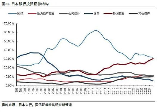1997年之前日本银行业证券投资结构较为稳定,1997年后日本加大了国债配置比例。在2011年日本陷入零低利率环境后,国债的配置规模大幅压缩,而是大幅增加了海外债券的配置比例。