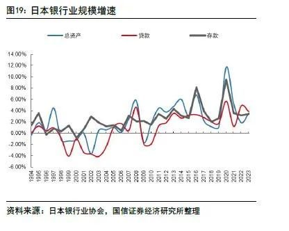 1998-2004年贷款规模压缩,2005年以来也仅维持小幅扩张。房地产泡沫破灭后,企业和居民持续去杠杆,实体部门信贷需求疲软。同时,伴随不良的大幅暴露,银行也开始惜贷。1997年的亚洲金融危机使得情况进一步恶化,日本银行业贷款和贴现票据总额自1998年开始连续7年负增长,合计压降了18.1%,压降规模接近90万亿日元。该阶段总资产规模也下降了6.1%,合计压缩了48万亿日元。2005年日本银行业贷款规模才恢复正增长,2009年和2010年因金融危机再次跌入负增长。2005-2019年日本银行业总资产、贷款总额和存款总额年均符合增速分别为2.9%、1.8%和2.9%。
