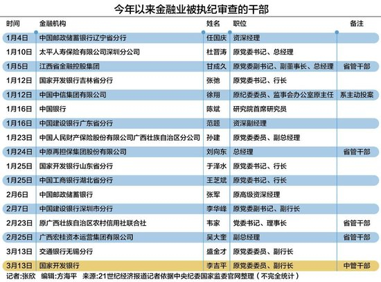 3月14日,21世纪经济报道记者依据中央纪委国家监委官网进行不完全统计,今年以来金融业有17位干部被执纪审查。这17人中,有4人是省管干部,1人为中管干部;国有大行及大型政策性银行均有涉及,落马人数最多的是国开行,共计3人落马;国家开发银行原党委委员、副行长李吉平为唯一的落马中管干部,也是今年全国“两会”后的首虎。