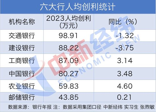 员工人数最少的交通银行,2023年人均创利最高,达到98.91万元,建设银行、工商银行和中国银行人均创利均超过80万元,分别为88.22万元、87.09万元和80.27万元。