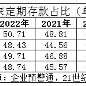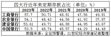 日前发布的年度财报显示,截至2023年末,四大行定期存款占比均超过50%(注:与上述央行口径略有不同),这也是近年来四大行定期存款占比首次均超过50%,工商银行、农业银行、建设银行、中国银行分别为57.7%、54.1%、53.61%、53.3%,其中2023年是定期存款占比提升最快的一年。