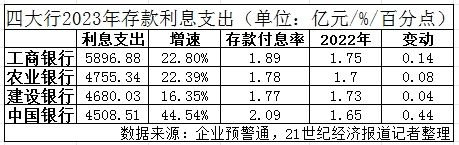存款余额的快速增长和存款平均付息率的提升,使得四大行2023年的存款利息支出也大幅增长,2023年均在4500亿元以上,从增速来看,中国银行达到44.54%,工商银行、农业银行均超过20%。