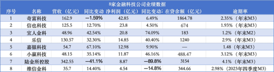 从业绩表现来看,8家机构全员盈利的同时,业绩增幅拉开较大差距,座次也出现较大变化。其中,奇富科技以42.85亿元的净利润排名第一,陆金所控股则出现了营收、净利双下滑。而在实现盈利的另一面,报告期内相关机构的资产质量有所下滑,从业机构在出海、AI等方面谋求变局。