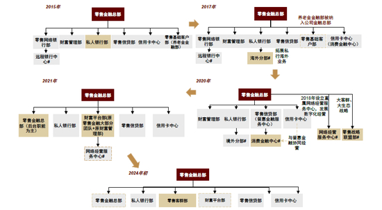 组织架构调整主动求变,为顺势而起积蓄力量。近期平安、招行等都进行了组织架构改革,2024年初招商银行进行了零售条线的组织架构改革,新设立零售客群部负责私行之外的全量客户经营与营销,而财富平台部则主要承担产品与资产配置相关的职能;平安银行对众多条线进行组织架构调整,使部门更加精简,决策链条更短,体现了总行瘦身、分行综合化的经营理念,给予分行更多经营决策自主权来根据自身所处区域特征进行充分的差异化发展,最终实现自动优化区域布局的效果,体现了对专业能力的重视、对集权与分权的思考等,给未来业务带来更多可能性。