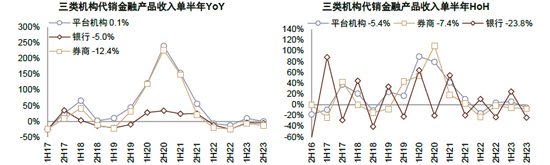图表4:2023年下半年样本银行、券商、平台类机构代销金融产品收入分别同比-5.0%、-12.4%、+0.1%