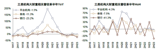 图表2:2023年下半年样本银行、券商、平台类机构大财富收入分别同比-23.2%、-11.3%、-1.5%,同比降幅较上半年有所扩大