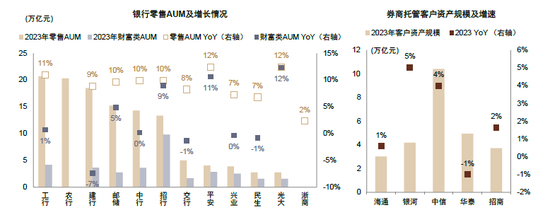 图表7:2023年平安、光大银行零售AUM、财富AUM同比增速均最快;券商中银河证券客户资产规模增速最快