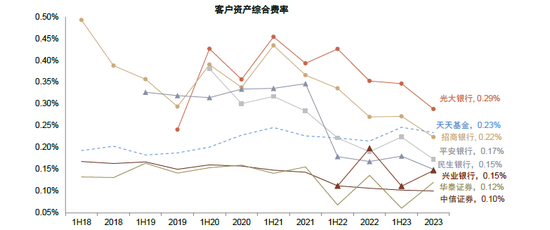 但AUM产品结构变化导致综合费率依然下行。2023年财富机构综合费率平均为0.18%、同比下降2.5bps。2023年财富类AUM、“财富AUM+活期存款”分别同比增长3.5%、2.1%。前者增速略有回升主要由于代销保险保费规模增长,而依然低于零售AUM整体增速则体现不产生直接收益的存款在AUM中占比提升。而后者增速进一步下行、与零售AUM增速仍有较大差距,则体现了更高成本的定期存款而非活期存款对AUM贡献增加。