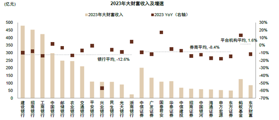图表1:2023年样本银行、券商、平台类机构大财富收入分别同比-12.6%、-8.4%、+1.6%