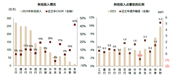 图表14:样本财富管理机构2021年以来科技投入保持较快增速,三年CAGR加权平均达到8.8%、简单平均达到12.3%;科技投入占营收的比例三年累计提升1.2ppt(简单平均)