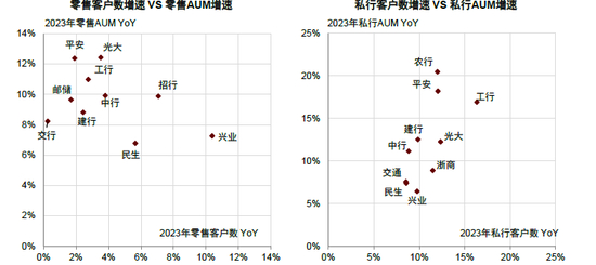 图表11:零售客群整体及私行客户现阶段经营模式有所区分,零售客户AUM增速普遍快于客户数增速,而私行AUM增速基本与客户数增速匹配