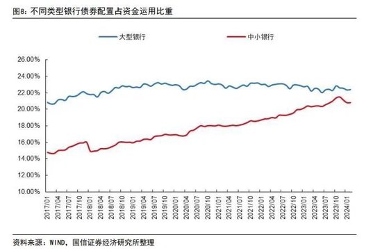 以工商银行和渝农商行为例,工商银行债券以配置盘为主,且主要持有政府债券。渝农商行交易盘占比更高,配置的企业债券和金融机构债券比例也更高。因此,如果配置风格不出现大变,中小银行存款增速的提升或更利好信用债,在政府债供给规模较大的情况下,大行存款增速回落或会对债券利率带来一定冲击。另外,交易盘比重提升会使得债券市场波动加大。
