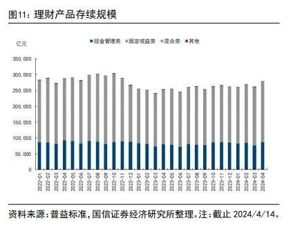 今年以来,居民配置理财和债基等低风险产品的比例已经有所回升。一季度居民新增存款虽依然高增,但较2022-2023年一季度均有所少增。同时,一季度新增非银存款1.56万亿元,明显高于往年同期,表明一季度居民或增配了理财等金融产品。根据普益标准统计,最新理财产品存续规模为27.98万亿元,较年初增加了1.77万亿元。主要是理财产品收益率相对于存款利率性价比有所提升,另一方面伴随经济的稳步复苏和资本市场的边际回暖,居民风险偏好略有提升。