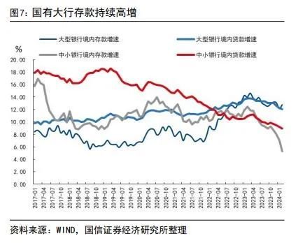 上文我们提到手工补息行为主要发生在对公业务,国有大行更为常见。主要是稳增长政策引导下,2022年以来国有大行加大信贷投放力度,资产负债相匹配驱动下,大行不断加大揽存力度,存款持续高增,2023年国有大行新增存款市场份额达到61.7%,2024年前两月进一步提升至76.9%。因此,加大手工补息等高息揽存行为监管对大行存款的冲击更大,我们认为大行和中小行存款增速会有所收敛,但在新形势下差异或长期存在。