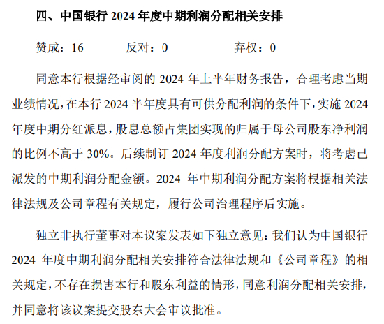 中国银行表示,同意本行根据经审阅的 2024 年上半年财务报告,合理考虑当期 业绩情况,在本行 2024 半年度具有可供分配利润的条件下,实施 2024 年度中期分红派息,股息总额占集团实现的归属于母公司股东净利润 的比例不高于 30%。后续制订 2024 年度利润分配方案时,将考虑已 派发的中期利润分配金额。