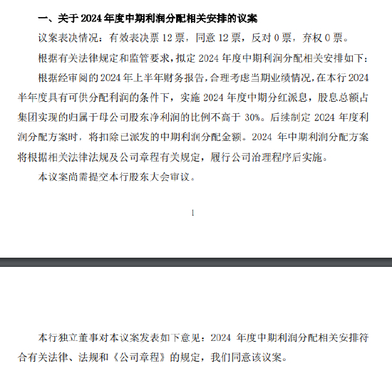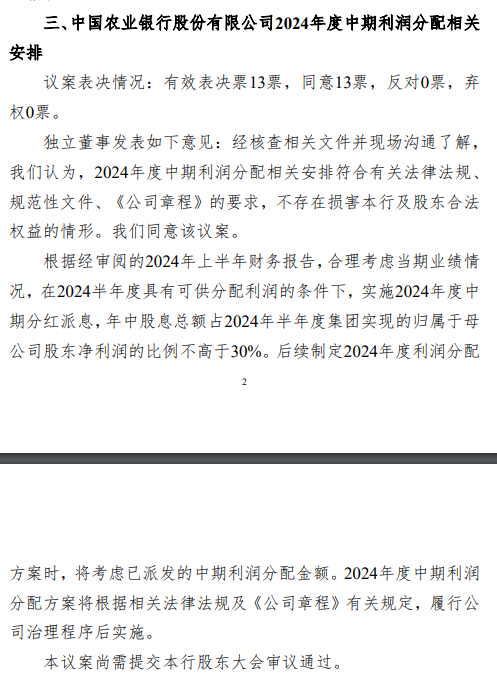 农业银行表示,根据经审阅的2024年上半年财务报告,合理考虑当期业绩情况,在2024半年度具有可供分配利润的条件下,实施2024年度中期分红派息,年中股息总额占2024年半年度集团实现的归属于母公司股东净利润的比例不高于30%。后续制定2024年度利润分配方案时,将考虑已派发的中期利润分配金额。