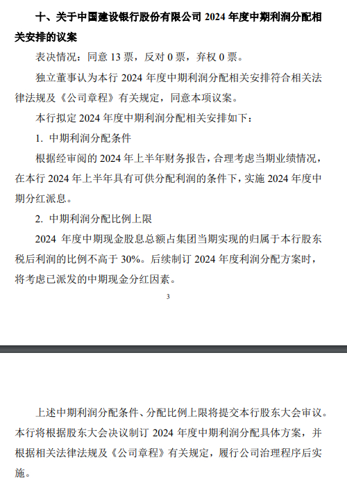 建设银行表示,2024 年度中期现金股息总额占集团当期实现的归属于本行股东税后利润的比例不高于 30%。后续制订 2024 年度利润分配方案时, 将考虑已派发的中期现金分红因素。