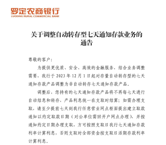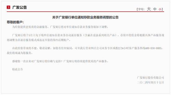 此外,就在4月中旬,广发银行也发布了《单位通知存款业务服务调整的公告》称,该行将于5月上旬下线单位通知存款业务自动滚存服务,存续中的资金将根据具体产品服务规则调整为非滚存服务模式或返还至客户的签约活期账户。