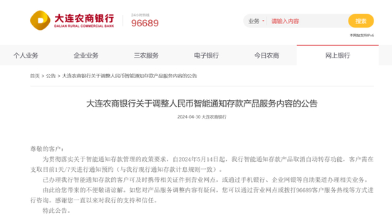 同样,大连农商行于4月底5月初,也分别在官网以及微信公众号等渠道发布公报表示,自2024年5月14日起,该行智能通知存款产品取消自动转存功能,客户需在支取日前1天/7天进行通知预约。