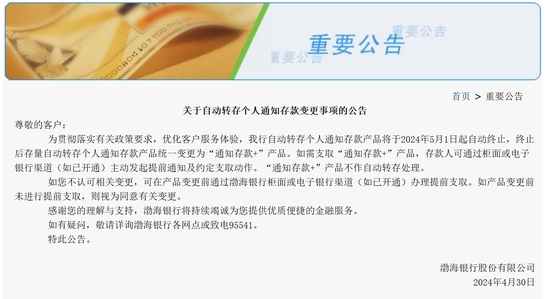 4月底,渤海银行发布公告称,该行自动转存个人通知存款产品将于2024年5月1日起自动终止,终止后存量自动转存个人通知存款产品统一变更为“通知存款+”产品。
