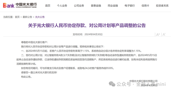面对持续下行的利率,光大银行4月30日公告宣布,下架智能通知存款产品,调整协定存款利率。“自5月15日起,若客户人民币协定存款利率高于1.15%,系统将自动分段计息并将协定利率调整为1.15%。”