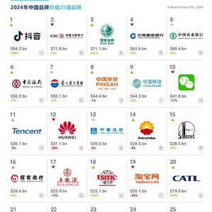 在银行业方面,报告指出,2024年上榜的中国银行品牌总品牌价值显著增长,达到了4504亿美元,较往年增长了2%。据不完全统计,2024年上榜的银行达59家,上榜银行业品牌达75家。国有四大行位列榜单前10。