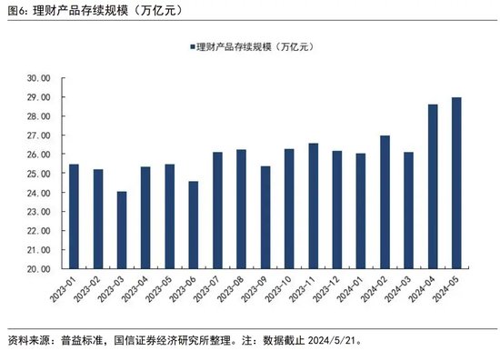 企业部门,企业存款下降,流向了理财等金融产品。企业存款下降,我们认为一方面是企业增加了理财等金融产品的配置,对应的金融投资规模大幅高增;另一方面反映了资金套利行为得到了有效的监管,企业融资规模有所下降。背后原因包括,一季度债券利率不断下行,理财、债基等产品收益率表现较好,企业增配金融产品;同时,理财借壳保险通道被严监管以及手工补息被叫停进一步带来企业存款流向理财,同时压缩了资金套利空间。年初以来理财产品规模也实现了不错的增长,尤其是4月增长明显,4月末理财产品余额为28.6万亿元,5月以来该趋势延续。