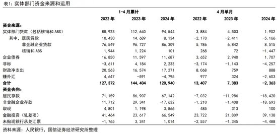 企业和居民合计获得资金约12.09万亿元,同比少增2.35万亿元。其中,银行投放贷款(包括核销和ABS)约9.45万亿元,同比少增1.81万亿元;企业债券融资1.17万亿元,财政净支出投放资金1.73万亿元,同比变动不大;非标融资2233亿元,同比少增1951亿元;另外,结售汇途径回笼资金4795亿元,同比少增4204亿元。资金去向,1-4月居民存款新增6.71万亿元,同比少增1.98万亿元;企业存款减少1.76万亿元,同比少增4.70万亿元;金融投资新增6.65万亿元,同比多增4.29万亿元;另外,未贴现银行承兑汇票(不涉及资金变动)新增1014亿元,同比少增2327亿元。