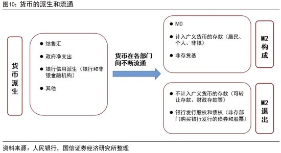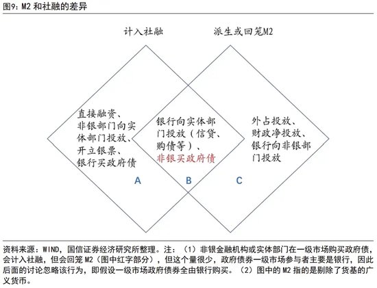 要理解社融和M2增量差异的来源,就需要理解各类经济活动如何影响社融和M2。我们将影响社融和M2的经济活动归为三类(图9),B部分是既计入社融又能派生M2的活动,A部分是计入社融但不派生M2的,而C部分是会派生M2但不计入社融。值得注意的是,2018年1月,人民银行调整了货币基金的统计方法,用非存款机构部门持有的货币市场基金取代货币市场基金存款(含存单),意味着非银金融机构也可以创造货币。但M2派生渠道分析中我们暂时不考虑该因素,因此图中的M2指的是剔除了货基部分的广义货币。