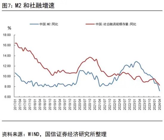 2024年4月末M2同比增速7.2%,社融同比增速是8.3%,环比分别回落1.1个和0.4个百分点。增量角度,4月M2减少3.60万亿元,剔除货基后减少了4.03万亿元;社融减少720亿元,即1月M2(不包括货基)比社融多减3.95万亿元。