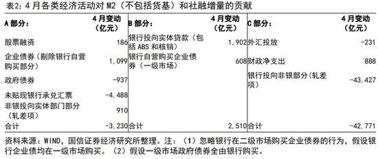 另外,由于银行投向非银部分是轧差项,因此这里除了体现非银金融机构的信用扩张外,像存款流向理财或者理财产品回表等因素对M2的影响也会体现在这个科目。结合4月份实际情况,存款流向理财现象比较明显,也会带来M2的下降,因为理财资金在一级市场购入利率债、银行发行的二永债及同业存单等行为也会回笼非银存款,从而降低M2。