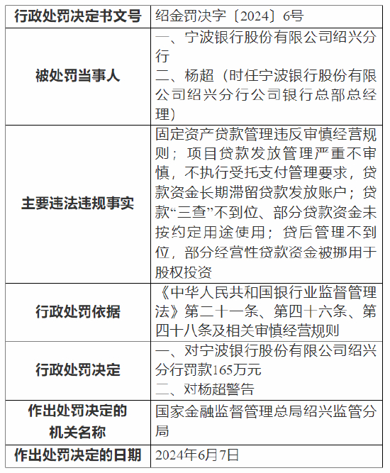 宁波银行绍兴分行被罚165万元:固定资产贷款管理违反审慎经营规则等