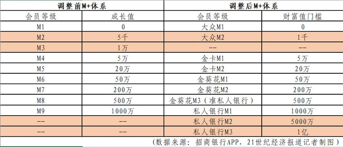 近日,21世纪经济报道记者获悉,招商银行通过APP发布了该行M+会员体系调整公告,新体系将自6月25日起生效。