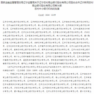 6月20日金融一线消息,国家金融监督管理总局辽宁监管局今日发布关于辽宁农村商业银行股份有限公司吸收合并辽宁新民农村商业银行股份有限公司等36家农村中小银行机构的批复。