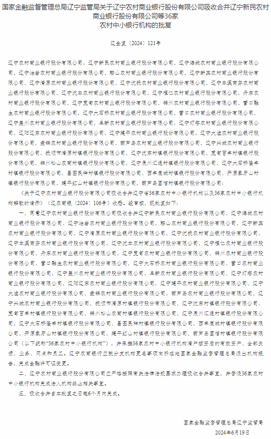 批复表示,同意辽宁农村商业银行股份有限公司吸收合并辽宁新民农村商业银行股份有限公司等36家农村中小银行机构,并承接36家农村中小银行机构清产核资后的有效资产、全部负债、业务、网点和员工。辽宁农商银行应就分支机构更名事项向所在地国家金融监督管理总局派出机构报告,完成金融许可证变更。
