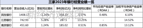 整体来看,民生银行尽管营收规模明显高于其他两家银行,但“增利不增收”的现象仍然不容乐观。至于南京银行,2023年的业绩表现同样十分严峻,只有江苏银行净利润同比出现两位数的增长,盈利能力较为强劲。