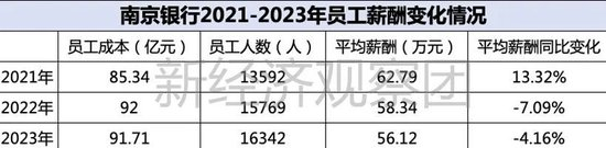 进入2023年,南京银行的员工薪酬继续下滑。数据显示,当年南京银行的员工成本为91.71亿元,员工人数进一步增至16342人,平均每位员工的薪酬降至56.12万元,平均月薪进一步下滑至4.68万元。