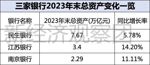 江苏银行和南京银行在2023年总资产均实现同比两位数的增长,但民生银行仍然以7.67万亿元的总资产规模领先其他两家银行。