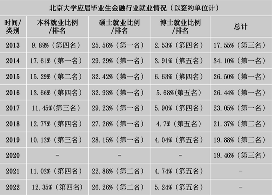 其中,北京大学流向金融行业的应届毕业生占比在2014年达到34.1%登顶,且连续霸榜四年。