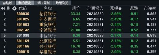 截止今日下午收盘,银行股有所回升,整体跌幅收窄至1.39%,但未能实现个股翻红。其中,招商银行、沪农商行、重庆银行、宁波银行、中信银行、北京银行、兴业银行、华夏银行等8家银行股价跌幅在2.0%及以上。
