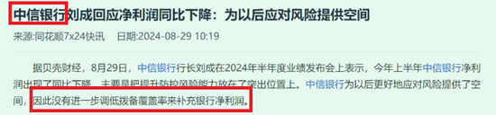 一则,是中信的行长,在半年度业绩发布会上表示,净利润同比下降了,且没有进一步调低拨备覆盖率去补充净利润的想法,因为未来可能风险会变多,把拨备留好,应对未来的大风大浪。