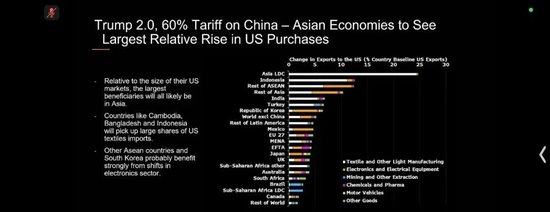 下午我和且涨哥一起,听了一个英文的路演,下面是其中一张核心的图,说的意思其实很简单,就是未来在川普2.0的关税下,老美的部分进口需求,将从东大,转移至亚洲的其他诸多国家,包括东南亚的纺织、韩国的电子元器件等等,这也是为什么,表舅跟投的表韭全球资产配置中,一直在等着东南亚科技ETF(513730)、中韩半导体ETF(513310)这些产品的场外联接基金,符合投顾标准后,择机配置的原因。