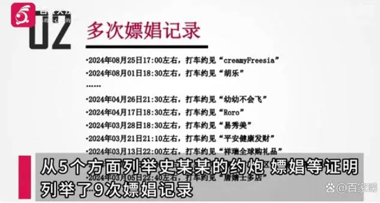 其中8月25日打网约车到深业有居金三角店进行嫖娼,支付creamyFreesia账户3000元。PPT内附有截图证明10次嫖娼金额为30330元,每次费用在2000元至5000元不等。同时,PPT还揭露史某某添加了300余名女性好友。