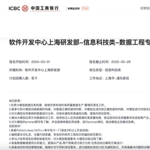 界面新闻记者查询发现,中国工商银行软件开发中心上海研发部正在招聘大模型方向的数据工程专家,招商银行总行信息技术部正在招聘基础大模型研发方向、大模型应用研究方向的人才,蚂蚁集团新发布的招聘职位中,大模型方向的算法专家赫然在列……