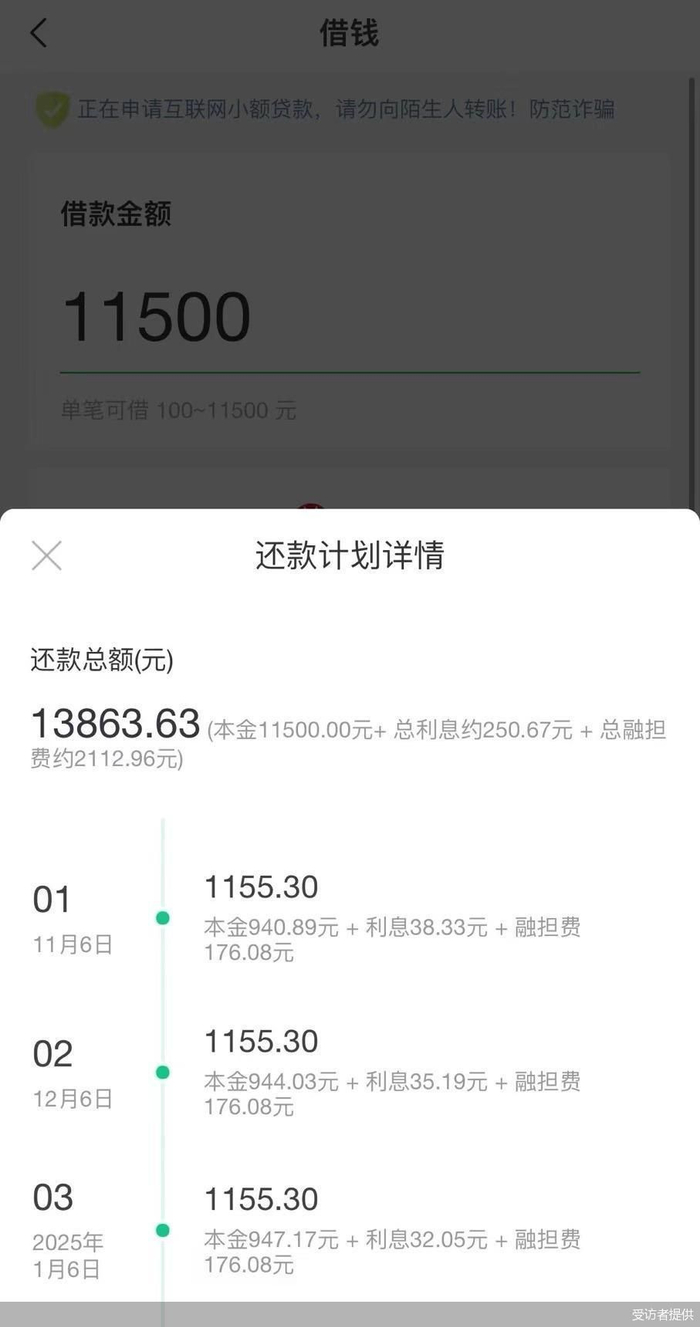 另外则是比利息费还高的融担费。从贷款页面来看,总还款额中,其中除了11500元的本金外,总利息约250.67元,此外还包含了约2112.96元的总融担费。“担保费比利息还要高,这对我来说压力太大了。”王瑶感慨。