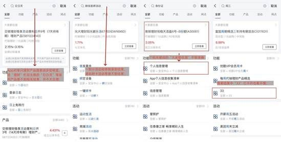 值得注意的是,App对单只理财/基金/保险产品的搜索进步较为明显,但“理财”栏目主推的“日日灵”等精灵系列搜不到结果;对活动的搜索也待提升,比如“微信首绑活动”等热门刷卡活动搜不到结果。此外,“大家都在搜”的准确度有提升也有优化空间,比如“身份证”猜不到合适结果;搜索结果中一些无用信息有待更新。