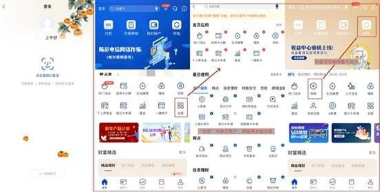 上海银行App“财富”频道顶部显示总资产、昨日收益,下方“9+1”十宫格模式推荐了各项产品和服务——囊括了理财、基金、保险、存款、实物贵金属、储蓄国债/柜台债、第三方存管(证券)、资管计划、信托、私募等,也可以进行风险评估、合格投资者认定和财富诊断(后期增加了“收益中心”)。