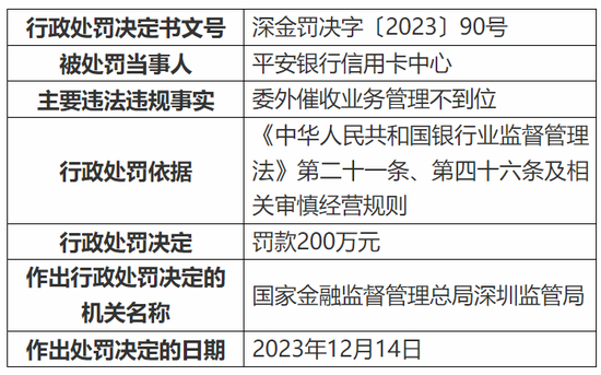 据公开资料检索,2023年以来,至少有5家银行因催收不当,收到了监管部门开出的高价罚单,包括兴业银行、中国民生银行、浦发银行、光大银行、平安银行,其中涉及“委外催收”的就有4家,处罚金额均超过40万元,最高的一张罚单出自平安银行,处罚金额高达200万。
