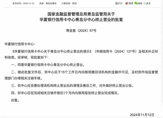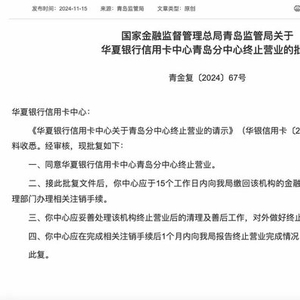 前不久,国家金融监督管理局青岛监管局批复,同意华夏银行信用卡中心青岛分中心终止营业。这已是该行第三个终止营业的信用卡分中心——