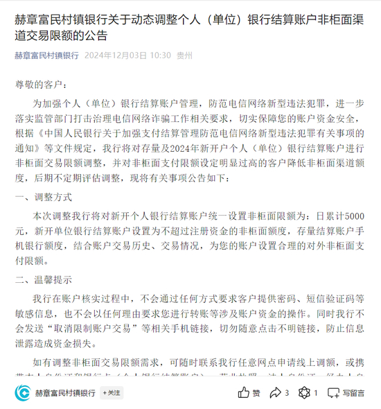 在公告中,赫章富民村镇银行表示,根据有关文件规定,该行将对存量及2024年新开户个人(单位)银行结算账户进行非柜面交易限额调整,并对非柜面支付限额设定明显过高的客户降低非柜面渠道额度,后期不定期评估调整。